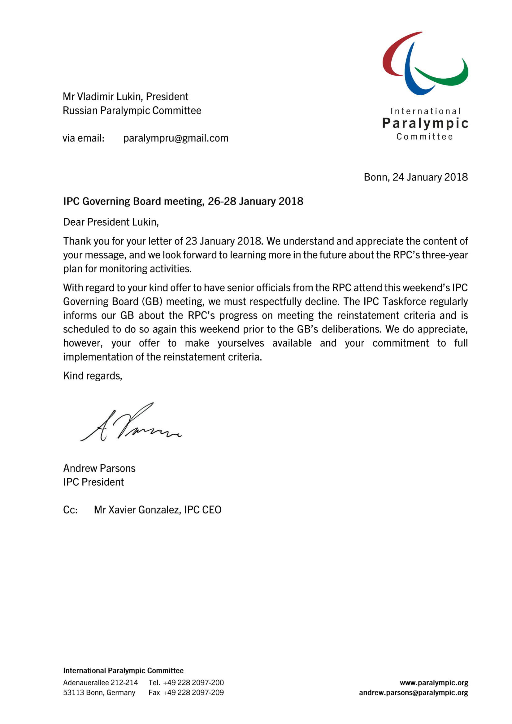 THE IPC PRESIDENT ANDREW PARSONS ABOUT PARTICIPATION OF RPC SENIOR OFFICIALS IN IPC GB MEETING 26-28 JANUARY 2018